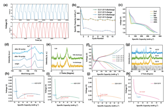 2@C在第一次循環(huán)中具有不同充電截止電壓的恒電流充放電曲線。(g) 第一次充電不同電壓下,電極的非原位 XRD 譜。圖 7(f) 的放大區(qū)域,電壓窗口為 (h) 4.3–1.0 V,(i) 4.0–1.0 V,( j) 3.5–1.0 V 和 (k) 3.0–1.0 V。