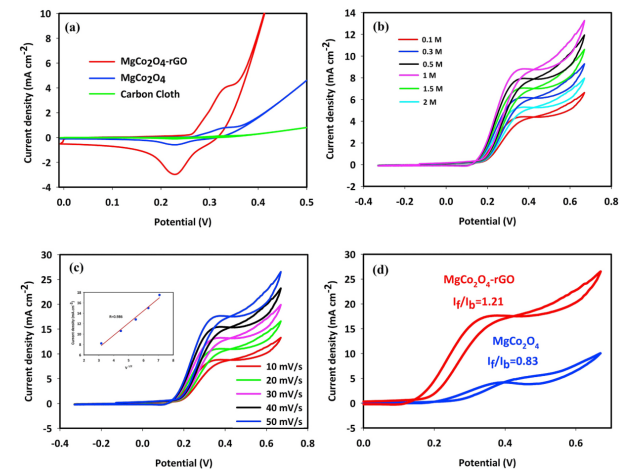 Figure 2. (a) 碳布、MgCo2O4和MgCo2O4-rGO在2 M KOH下的CV曲線;(b) 不同甲醇濃度下和(c)在不同掃描速率下,MgCo2O4-rGO的CV曲線(插圖是電流密度與掃描速率的平方根);(d) 以及MgCo2O4和MgCo2O4-rGO在 1 M 甲醇和 2 M KOH 溶液中CV 曲線的比較。