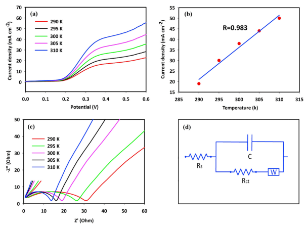 Figure 3. MgCo2O4-rGO在不同溫度下的 LSV 曲線 (a)、電流密度對溫度 (b);MgCo2O4-rGO在不同溫度下的 EIS 圖 (c) 以及相關(guān)等效電路(d)。