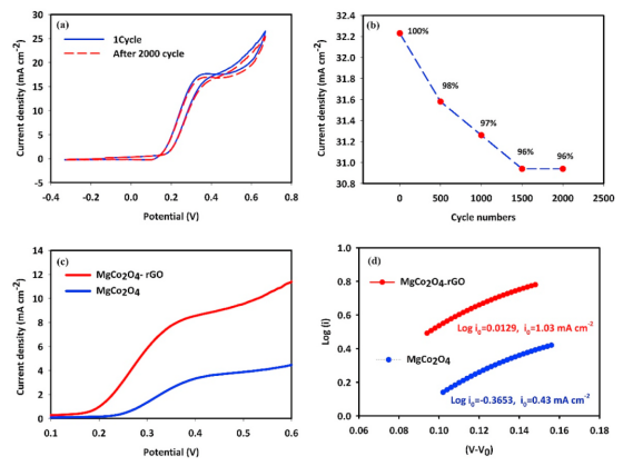 Figure 4. MgCo2O4-rGO的第 1 次和第 2000 次 CV 循環(huán) (a),MgCo2O4-rGO的電流密度與循環(huán)次數(shù) (b),以及MgCo2O4和MgCo2O4-rGO催化劑的 LSV 曲線 (c) 和相關(guān)的 Tafel 圖。