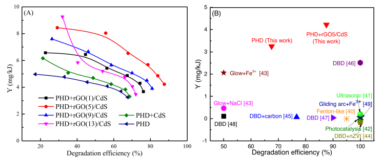 Figure 4. (A) BPA能效曲線,(B) 能效與其他競爭性 BPA 降解技術(shù)的比較
