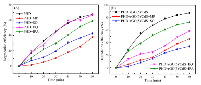 Figure 6. 在 (A) PHD 系統(tǒng)、(B) 等離子體輔助催化系統(tǒng)中,在rGO(5)/CdS納米復(fù)合材料上,不同清除劑的 BPA 降解效率