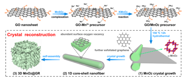 Figure 1. 三維分級(jí)MnO2@GR的合成路線和模型示意圖。該三位分級(jí)結(jié)構(gòu)是通過硫酸錳的絡(luò)合、高錳酸鉀的氧化、MnO2在水熱條件下的晶體生長(zhǎng)和1D核殼納米纖維的自組裝過程合成的。