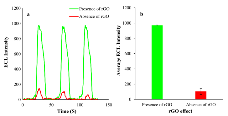 2+混合液中有無還原氧化石墨烯的三個連續(xù)的ECL信號。(b)平均ECL強度對應的直方圖。