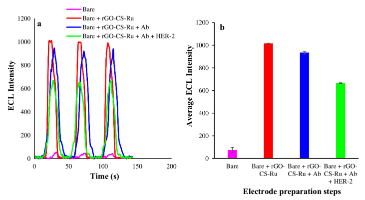 圖2. 電極制備步驟。(a)裸玻碳電極、玻碳+rGO-CS-Ru、玻碳+ rGO-CS-Ru+Ab、玻碳+ rGO-CS-Ru+Ab+HER-2等四種電極的三個連續(xù)的ECL信號圖。(b)對應的平均ECL強度的直方圖。