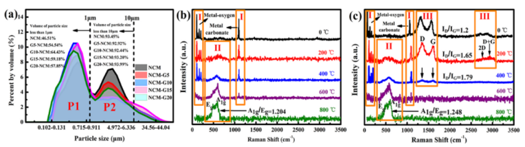 圖 3. (a) 各種樣品的粒度分布圖。(b) NCM和(c) G10-NCM在0℃至800℃的拉曼光譜。