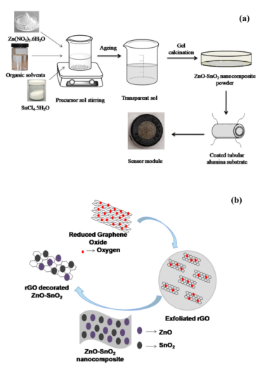 2納米復(fù)合材料的示意圖,然后進(jìn)行傳感器制備。(b)制備rGO修飾的ZnO-SnO