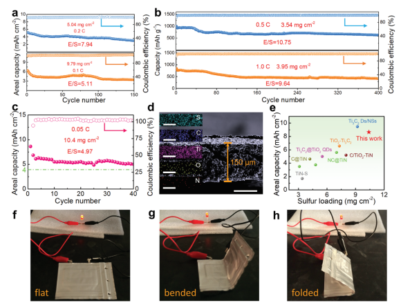 Figure 4. a) 0.1 C下,G-TiO2/TiN@S正極的循環(huán)性能。b) 0.5 C和1.0 C下,G-TiO2/TiN@S 正極的循環(huán)性能。c) G-TiO2/TiN@S正極在0.05 C下的循環(huán)性能。d) G-TiO2/TiN@S正極的橫截面 SEM 圖像和相應(yīng)的元素圖。e) 與其他報(bào)道的鈦基硫主體相比,高負(fù)載G-TiO2/TiN@S正極的面積容量。f-h) 演示處于各種彎曲狀態(tài)以連續(xù)點(diǎn)亮LED指示燈的Li-S軟包電池。比例尺:100 µm (d),插圖:150 µm。