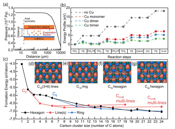 在這項研究中,開發(fā)了一種鄰近催化路線,用于在銅箔上快速生長石墨烯/h-BN垂直異質結構,該路線顯示出大大提高的合成效率(比其他路線快500倍)和良好的結晶質量石墨烯(大單晶長度高達10微米)。我們合成路線的主要優(yōu)勢是使用轉盤將新鮮的銅箔(或銅泡沫)引入高溫區(qū);在高溫下,Cu蒸氣作為氣態(tài)催化劑,可以降低石墨烯生長的能壘,促進碳源的分解。因此,在Cu基板上生長第一層六方氮化硼后,可以通過引入新鮮催化劑生長另一層石墨烯。我們的計算揭示了懸浮催化劑蒸發(fā)的銅蒸氣的催化作用和石墨烯生長貢獻。我們還研究了h-BN/Cu上從1到24個碳原子的石墨烯的生長順序,并確定了這些碳簇的形態(tài)演變。在這方面,可以合成多層堆疊的異質結構,從而增加它們在高性能電子設備和能量收集/轉換方向的潛在應用。