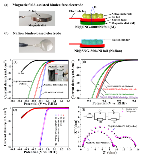 析氫反應(yīng)(HER)急需有效的非貴金屬催化劑。N摻雜石墨烯和具有成本效益的金屬的混合有望成為增強(qiáng)HER性能的有前途的方法,但在可控制造方面面臨瓶頸。在此,開(kāi)發(fā)了一種二氧化硅介質(zhì)輔助方法,用于高效合成單層N摻雜石墨烯封裝鎳納米粒子(Ni@SNG),其中通過(guò)抑制氣態(tài)碳自由基反應(yīng)物的擴(kuò)散,二氧化硅納米片分子篩巧妙地輔助單層石墨烯在Ni上的自限性生長(zhǎng)納米粒子。在800 °C合成的Ni@SNG樣品在堿性介質(zhì)中表現(xiàn)出優(yōu)異的HER活性,在10 mA cm−2下具有99.8 mV的低過(guò)電位,接近最先進(jìn)的Pt/C催化劑。值得注意的是,Ni@SNG催化劑也被開(kāi)發(fā)為磁場(chǎng)中的無(wú)粘合劑電極,其性能比普通的Nafion粘合劑基電極有很大提高。因此,磁性吸附技術(shù)將是克服聚合物粘合劑基電極在實(shí)際應(yīng)用中的高電子電阻和較差粘附穩(wěn)定性的一種非常有前景的方法。