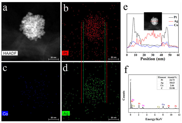 Figure 2. (a) Ag@PtCo-rGO的HAADF圖像。Ag@PtCo-rGO的(b)Pt(紅色)、(c)Co(藍(lán)色)和(d)Ag(綠色)的EDS元素映射圖。Ag@PtCo-rGO納米花的(e)EDS譜線和(f)EDS譜。