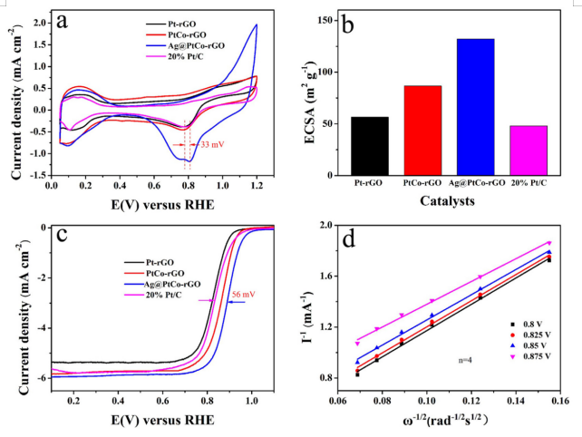 Figure 3. Pt-rGO、PtCo-rGO、Ag@PtCo-rGO 和 20% Pt/C在0.1 M HClO4溶液中測量的 (a) CV、(b) ECSA和 (c) LSV 曲線。(d) Ag@PtCo-rGO在0.8-0.875 V 下的 Koutecky-Levich 圖。