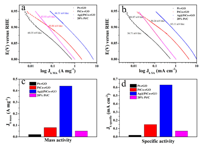 Figure 4. (a-b) Pt-rGO、PtCo-rGO、Ag@PtCo-rGO 和 20% Pt/C 的 Tafel 圖。 (c) MA 和 (d) SA 用于催化劑。