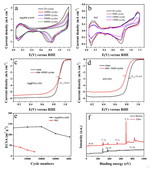 Figure 5. (a,b)循環(huán)伏安曲線和(c,d)ORR極化曲線。(e) Ag@PtCo-rGO和20% Pt/C的ECSA。(f) 在40,000次循環(huán)之前和之后的 XPS 測量光譜。