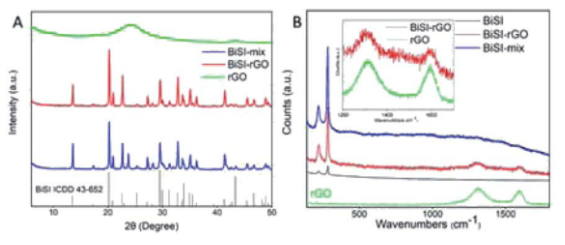 Figure 2. BiSI–rGO、BiSI–mix和rGO粉末的PXRD模式(A)以及BiSI–rGO和rGO粉末的拉曼光譜(B)。