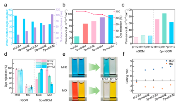 Figure 2. 具有pH響應(yīng)納米通道氧化石墨烯膜用于高性能納濾。(a)水接觸角和表面粗糙度,(b)純水滲透性和對(duì)羅丹明B染料的排斥性,(c)nGOM和5p-nGOM在不同pH下的水滲透性,(d)GOM和5p-nGOM對(duì)MnB (+)和MO(-)的排斥性,(e)將MnB和MO的進(jìn)料溶液和通過(guò)5p-nGOM 膜過(guò)濾,(f)GOM和5p-nGOM的門(mén)控比率。