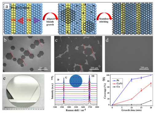 Figure 1. 在鉑襯底上生長(zhǎng)6英寸單晶石墨烯。(a)生長(zhǎng)單晶石墨烯的示意圖。(b-d)石墨烯分別在鉑薄膜上生長(zhǎng)5、10和20分鐘的掃描電鏡圖像。(e)Pt/Al2O3上生長(zhǎng)6英寸單晶石墨烯的照片。(f)拉曼光譜。(g)石墨烯在Pt、CuNi和Cu薄膜上的覆蓋率。