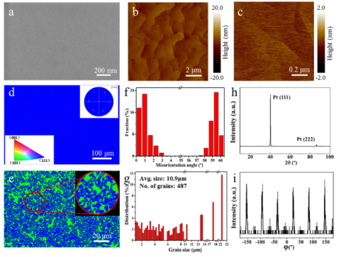 Figure 2. 退火后T-Pt薄膜的表征。(a)掃描電鏡圖像。(b-c)原子力顯微鏡圖像。(d) EBSD面外掃描圖。(e)EBSD面內(nèi)掃描圖。(f)鉑的取向分布。(g) 孿晶域的尺寸分布。(h)退火后Pt膜的XRD圖。