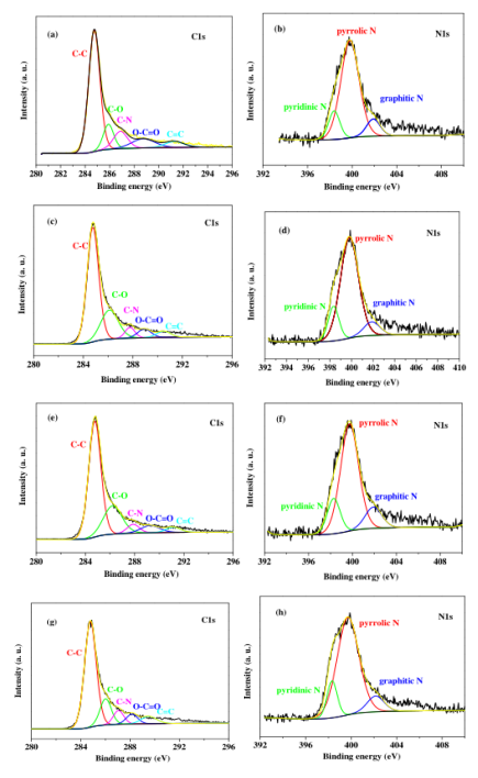 圖4. 3D N-GA(1) 的(a) C1s和(b)N1s XPS光譜;3D N-GA(2) 的(c) C1s和(d)N1s XPS光譜;3D N-GA(3) 的(e) C1s和(f)N1s XPS光譜;3D N-GA(4) 的(g) C1s和(h)N1s XPS光譜