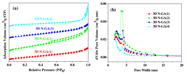 2吸附-解吸等溫線和(b)相應(yīng)3D N-GA(x)的孔徑分布