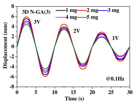 圖10. 不同3D N-GA(3)驅(qū)動(dòng)器在0.1 Hz不同輸入電壓(1-3 V)下的電致位移