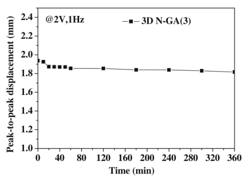 圖13. 3D N-GA(3)驅(qū)動(dòng)器在2V和1Hz下的峰對(duì)峰值的位移耐久性結(jié)果(6h)