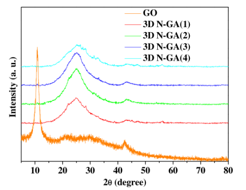 圖2. 氧化石墨烯及不同3D N-GA(x)的XRD圖譜