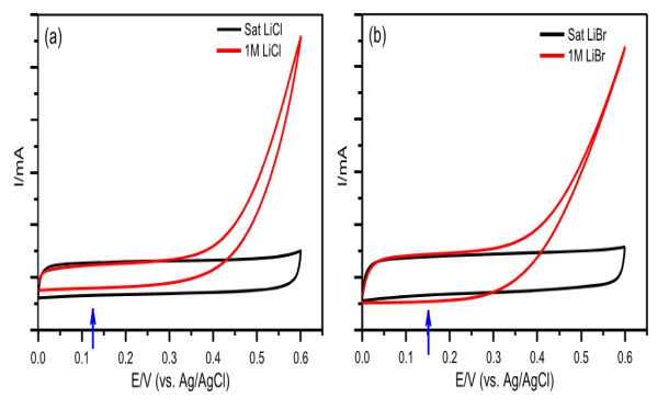 Figure 1.(a)MXene電極在稀釋和濃縮的(a)LiCl和(b)LiBr電解質(zhì)溶液中的循環(huán)伏安圖,以10 mV/s測試。藍(lán)色箭頭代表集中系統(tǒng)中電極的OCV。