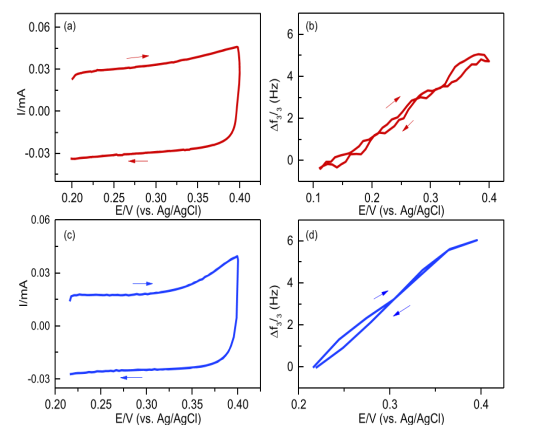 2電極的CV響應(yīng)。掃描方向由黑色箭頭指示。(b)在電位掃描期間記錄的頻率變化。理論頻率變化顯示為黑色虛線。
