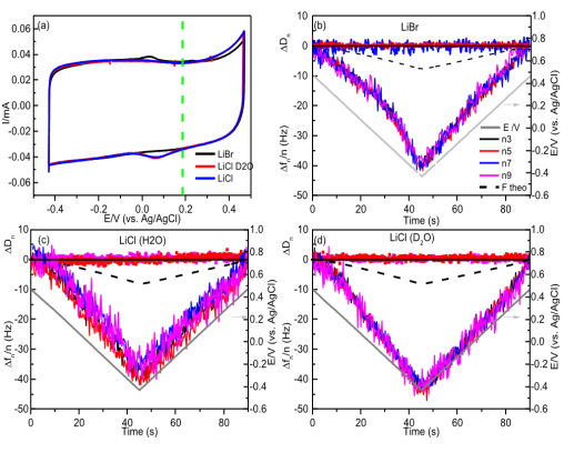 2O中)和LiBr電解質(zhì)溶液中在20mV/s下獲得的循環(huán)伏安圖。(b-d)頻率和損耗隨時(shí)間的變化,在D