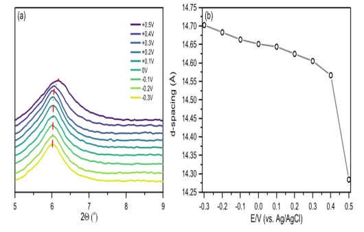 Figure 5.(a)在-0.3至0.5 V電位掃描期間測量的2q值的變化(相對(duì)于Ag/AgCl)。(b)MXene電極d間距的相應(yīng)變化。