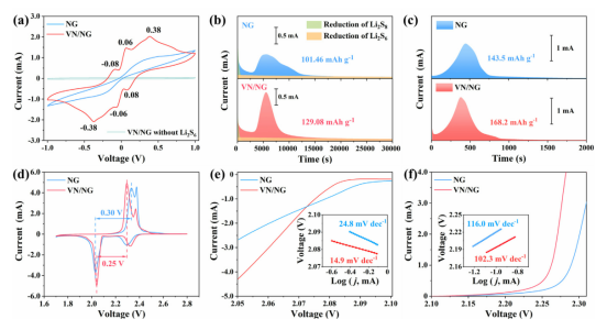 圖2. NG和VN/NG對(duì)多種多硫化物參與反應(yīng)的電催化性能。(a)掃描速率為1 mV s