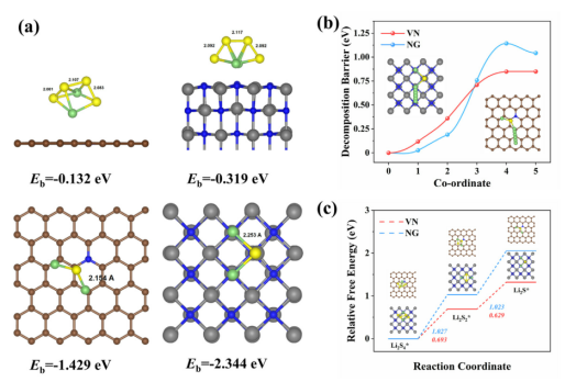 a)驗(yàn)證了VN/NG的催化效果,在氧化還原的兩個(gè)方向上,VN/NG的活化能都小于NG。由于VN/NG的協(xié)同吸附催化作用,采用VN/NG改性隔膜的電池具有優(yōu)異的倍率性能(在5C 時(shí)為791 mAh g