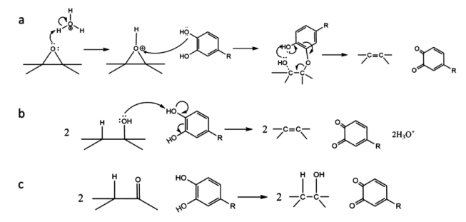 圖 3. 橄欖多酚提取物還原 (a) 環(huán)氧基、(b) 羥基和 (c) 羰基所涉及的可能的反應(yīng)機(jī)制。