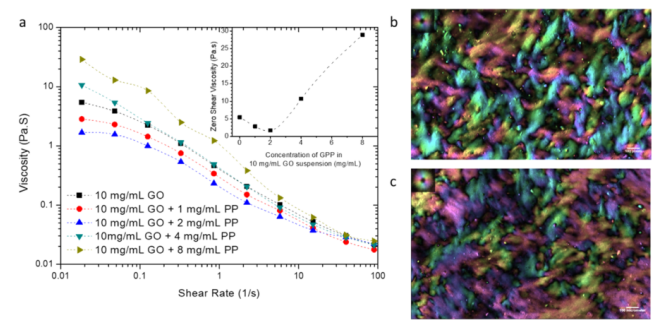 圖 4. GO和ZERS分散體的流動特性和相行為。 (a)穩(wěn)態(tài)剪切測量和零剪切粘度(插圖),(b)GO和(c)ZERS(含有10 mg/mL GO和1 mg/mL多酚)分散體的偽彩色偏振光顯微照片。