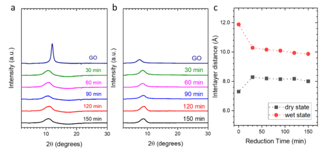 圖 6. (a)干態(tài)ZERS的XRD圖。 (b)濕態(tài) ZERS 膜的XRD圖。 (c)層間距離隨干態(tài)(黑色方塊)和濕態(tài) ZERS(紅色圓圈)還原時間增加。