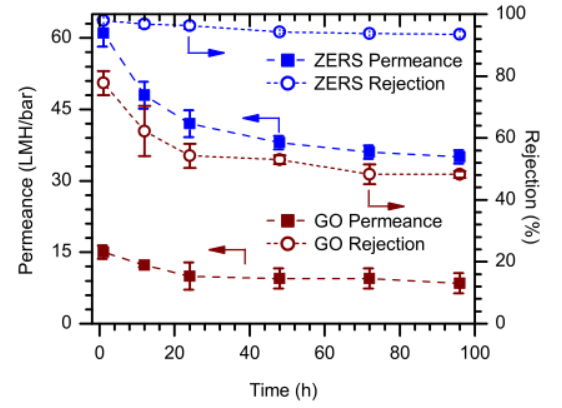圖 8. 最佳 ZERS(70 ℃- 90min)和未改性GO膜的長期錯流性能。
