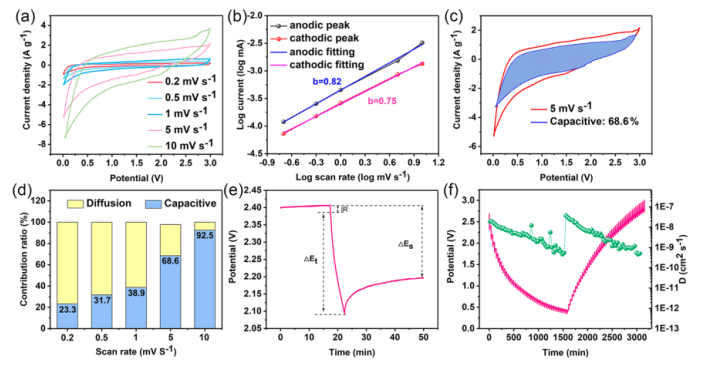 -1掃描速率下的電容貢獻(xiàn)。 (d)MRPG/CNT 作為陽(yáng)極在不同掃描速率下的電容貢獻(xiàn)。 (e)單次滴定時(shí)施加的電流脈沖與電壓曲線。 (f) MRPG/CNT的GITT曲線和從GITT曲線得出的Li