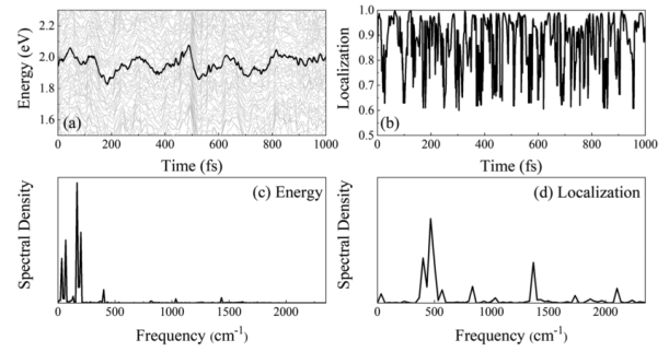 2 上PE態(tài)定位的演化。通過對每個量的自相關(guān)函數(shù)執(zhí)行傅立葉變換 (FT), (c) PE狀態(tài)能量和 (d) 定位的光譜密度。 (c)中高于 800 cm
