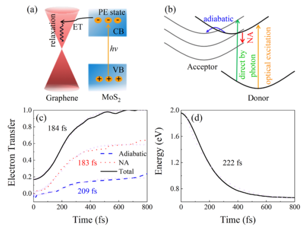 2 CB內(nèi)的激發(fā)態(tài)。 然后,PE電子被注入石墨烯CB,與電子-聲子能量弛豫有關(guān)。 (b) 光致ET機(jī)制。 PE電子可以通過過渡態(tài)勢壘(彎曲的藍(lán)色箭頭)從供體絕熱地注入受體。 或者,注射可以非絕熱進(jìn)行,在供體和受體狀態(tài)之間跳躍(向下的紅色箭頭)。 光激發(fā)可以促進(jìn)電子從供體基態(tài)直接轉(zhuǎn)移到受體激發(fā)態(tài)(向上的綠色箭頭)。 (c) 平均 ET 動力學(xué)。 黑色實線、藍(lán)色虛線和紅色虛線分別代表總、絕熱和 NA ET。 空心圓圈是具有圖中所示時間尺度的擬合數(shù)據(jù)。 由于供體-受體耦合較弱,NA機(jī)制在ET事件中占主導(dǎo)地位。 (d) PE狀態(tài)能量的衰減。 能量弛豫比ET慢,表明PE電子可以在冷卻到帶邊緣之前被石墨烯成功提取。