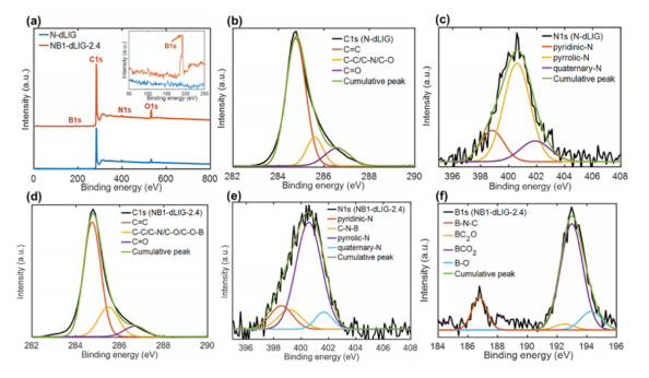 圖5. (a) N-dLIG和NB1-dLIG-2.4在結(jié)合能為0 ~ 800 eV范圍內(nèi)的x射線光電子能譜(XPS)調(diào)查掃描譜,以及(插圖)在結(jié)合能在50 ~ 250 eV范圍內(nèi)的擴展掃描譜;N-dLIG的(b) C1s和(c) N1s高分辨率光譜;NB1- dLIG-2.4的 (d) C1s、(e) N1s和(f) B1s高分辨率光譜