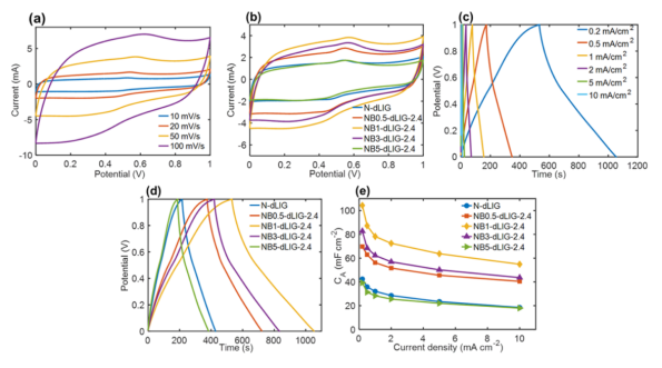 3負(fù)載(1 wt%)和重復(fù)激光功率(2.4 W; NB1-dLIG-2.4) ,由于N和B共摻雜的協(xié)同作用,NB-dLIG的電容性能顯著提高。NB1-dLIG-2.4電極提供了104.3 mF/cm