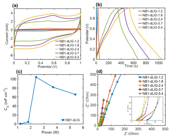 2時,不同功率合成的NB1-dLIG電極的二次激光熱解的恒電流充放電(GCD)曲線;(c)電流密度為0.2 mA/cm