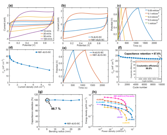2時,NB1-d-LIG-SC在不同彎曲半徑下的電容保持率;(h)使用CO2激光與之前報道的未摻雜和摻雜的LIG SCs和MSCs相比,NB1-dLIG-SC的比面積Ragone圖。
