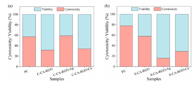 圖 8. HEK293細胞暴露于RGO和NPs修飾的 (a) 棉織物和 (b) 絲織物時的細胞毒性和活力。