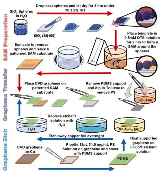 圖 1. 模板自組裝、化學(xué)氣相沉積(CVD)石墨烯制備以及隨后轉(zhuǎn)移到圖案化SAM基板的示意圖。