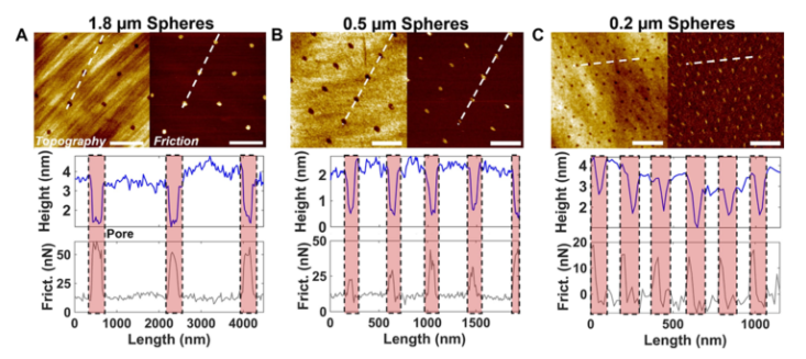 使用 (A) 1.8μm 球體、(B) 0.5μm 球體和 (C) 0.2μm球體作為模板的具有相應(yīng)空孔橫截面的形貌和摩擦圖像。 對(duì)于所有圖像,橫截面位置由白色虛線(xiàn)表示,孔在橫截面中由粉紅色框表示。 比例尺為 (A) 2、(B) 0.5 和 (C) 0.5μm。