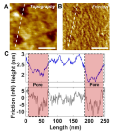 圖 5. 石墨烯與 0.2μm PFPA填充孔反應(yīng)的AFM形貌(A)和摩擦(B)圖像以及相應(yīng)的橫截面 (C)。 對(duì)于這兩個(gè)圖像,橫截面位置由白色虛線(xiàn)表示,比例尺為 0.1μm。