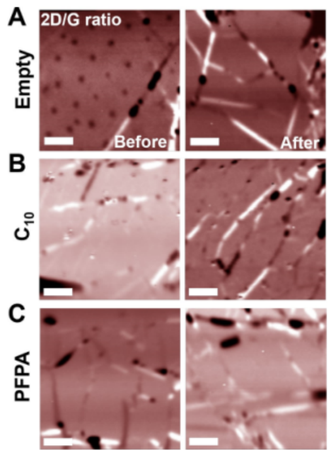 圖 7. 在 140℃加熱前后,空孔 (A)、C10孔 (B) 和PFPA孔 (C)在較大孔系統(tǒng)(1.8μm微球模板)上的石墨烯拉曼圖譜。 比例尺為2μm。
