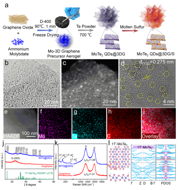 圖 1. (a) MTQ@3DG/S的合成策略方案。 (b) MTQ@3DG的TEM圖像。 (c) 相應的 HAADF-STEM 圖像。 (d) HRTEM 圖像。 (e-i) MTQ@3DG的HAADF-STEM 和EDX 元素映射圖像。 MTQ@3DG和石墨烯的XRD圖(j)和拉曼光譜(k)。 (l) 1T'-MoTe